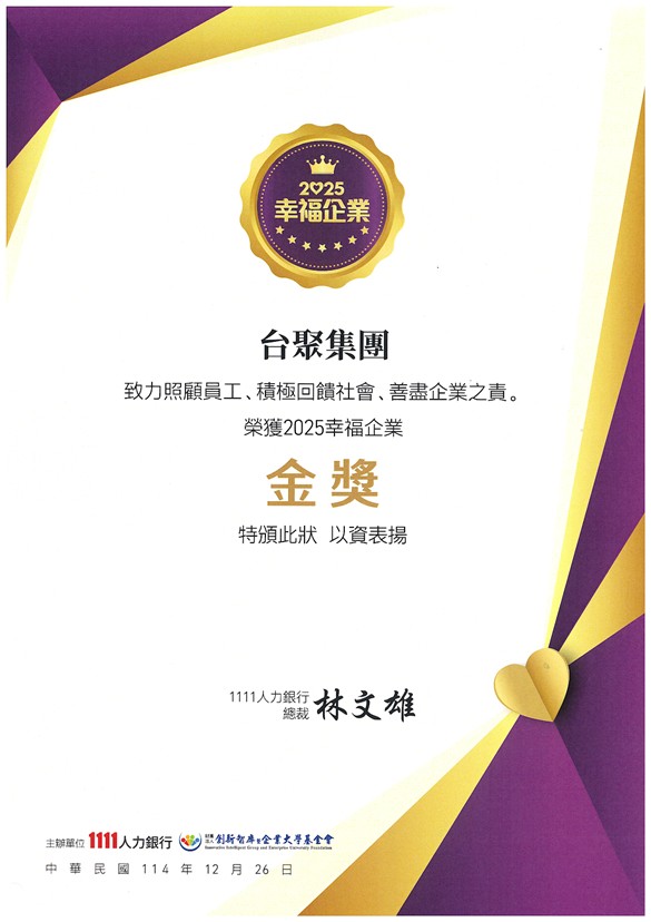 以人為本、打造幸福職場- 台聚集團榮獲2025年度人力銀行「幸福企業金獎」